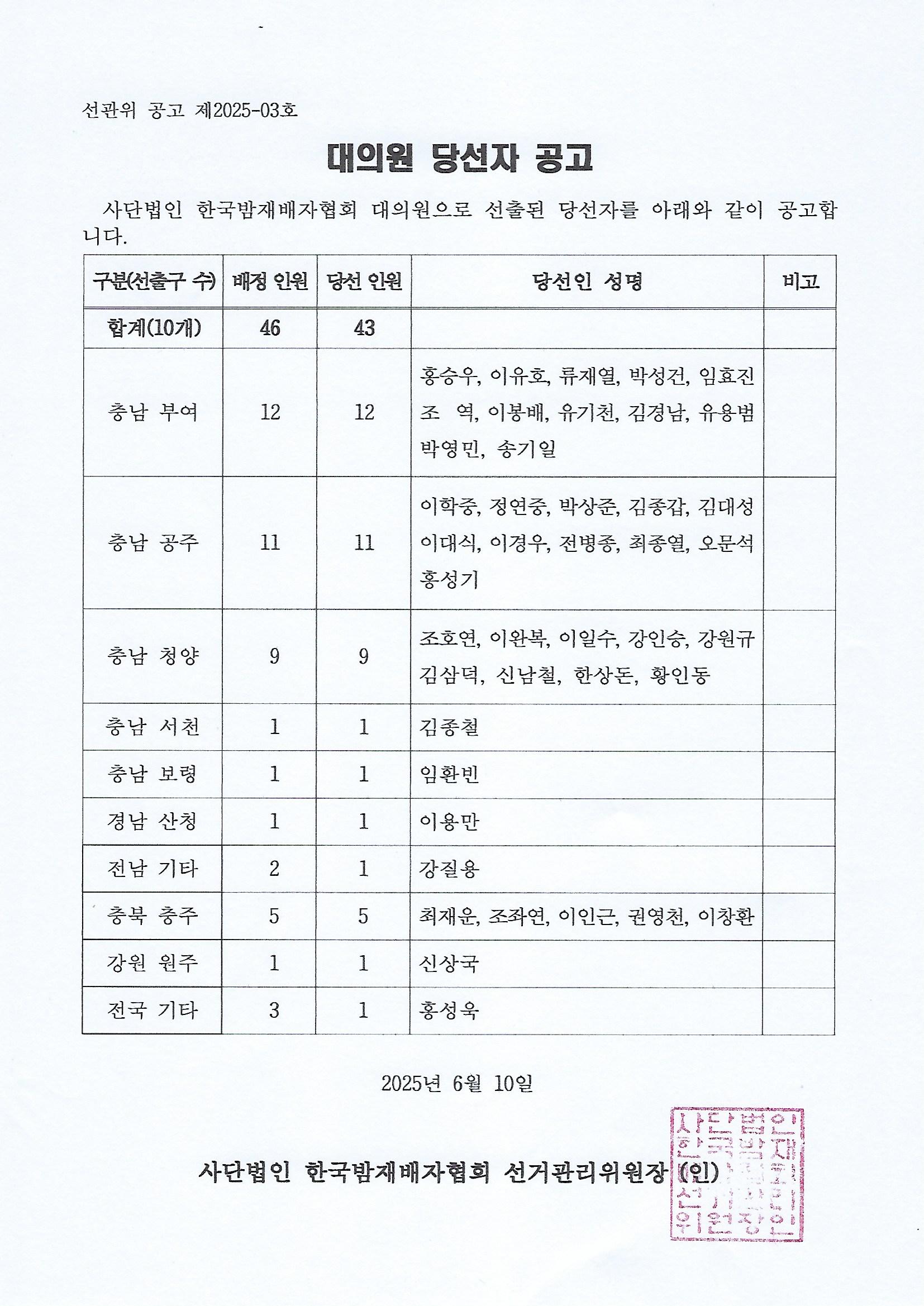 대의원 당선자 공고